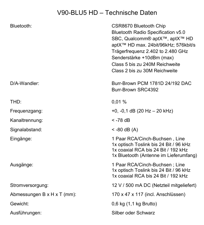 Der V90-BLU5 HD ist ein anspruchsvoller Bluetooth-Empfänger, ideal für das Empfangen von Musik von Smartphone, Tablet, PC und Mac direkt zu Ihrer HiFi-Anlage. Außerdem kann er als Digital/Analog-Wandler für viele digitale Anwendungen wie TV, Receiver und andere digitale Quellen eingesetzt werden. Direkt mit Ihrer HiFi-Anlage verbunden, liefert der V90-BLU5 HD hochwertigen Klang von seinem internen Digital/Analog-Wandler und den hochwertigen analogen Ausgangsstufen. Gerade die vielfältigen Onlineplattformen liefern eine Unmenge interessanten Film- und Tonmaterials, welches bei Verwendung des V90-BLU5 HD nicht mehr über die minderwertigen Lautsprechern in Smartphones und Tablets gehört werden muss. Mit dem V90-BLU5 HD können Sie per Bluetooth übertragenen Sound in bekannter MUSICAL FIDELITY-Soundqualität über Ihr HiFi-System genießen.