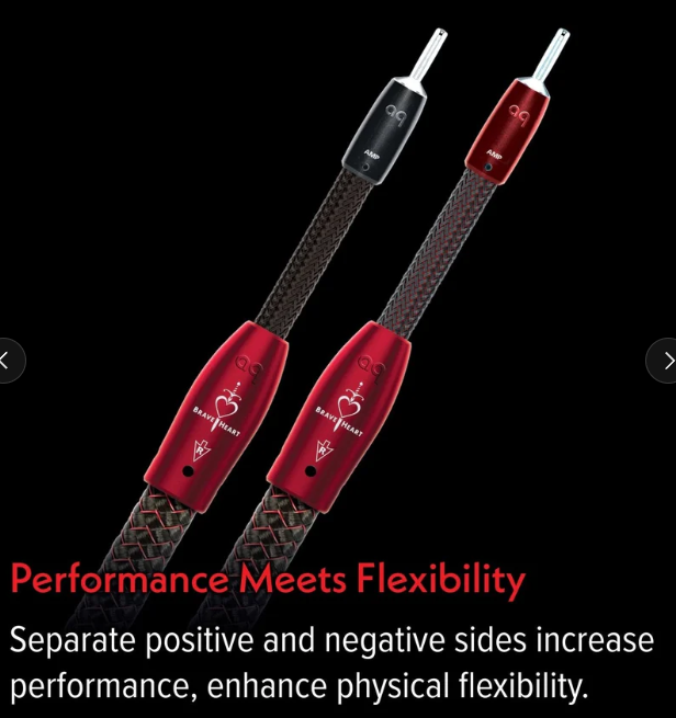 Körperlich ist Brave Heart fast so groß wie die mythischen Lautsprecherkabel von AudioQuest, nur 0,6 mm kleiner im Außendurchmesser. Intern hat es fast ein Drittel mehr des gleichen hervorragenden Perfect-Surface Copper+ Leiter-Metalls wie in früheren Modellen, was es zu einem etwas kleineren Mythical Creature macht. Dennoch ist Brave Heart physisch leichter handhabbar, da es positive und negative Seiten in separaten runden Konstruktionen unterbringt.