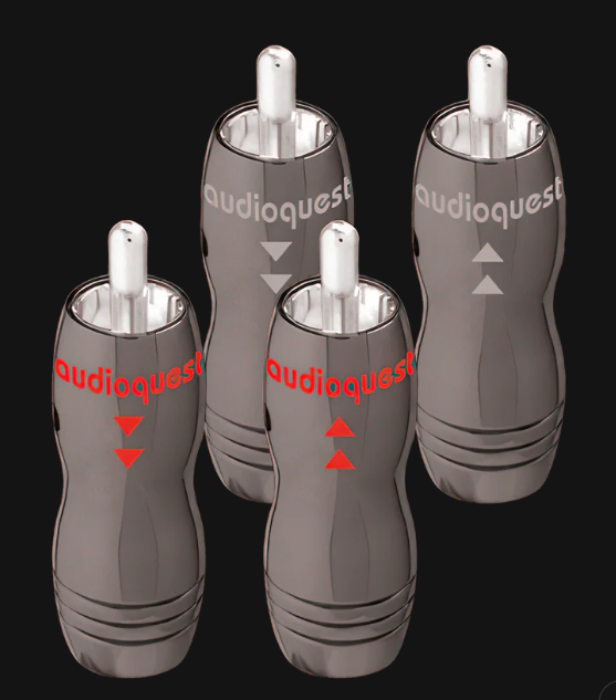 Ein Paar Premium-Männliche RCA-Stecker mit Pfeilen auf den Hülsen zur Kennzeichnung der Leitungsrichtung. Passend für Kabel mit einem Außendurchmesser von bis zu 9,0 mm.