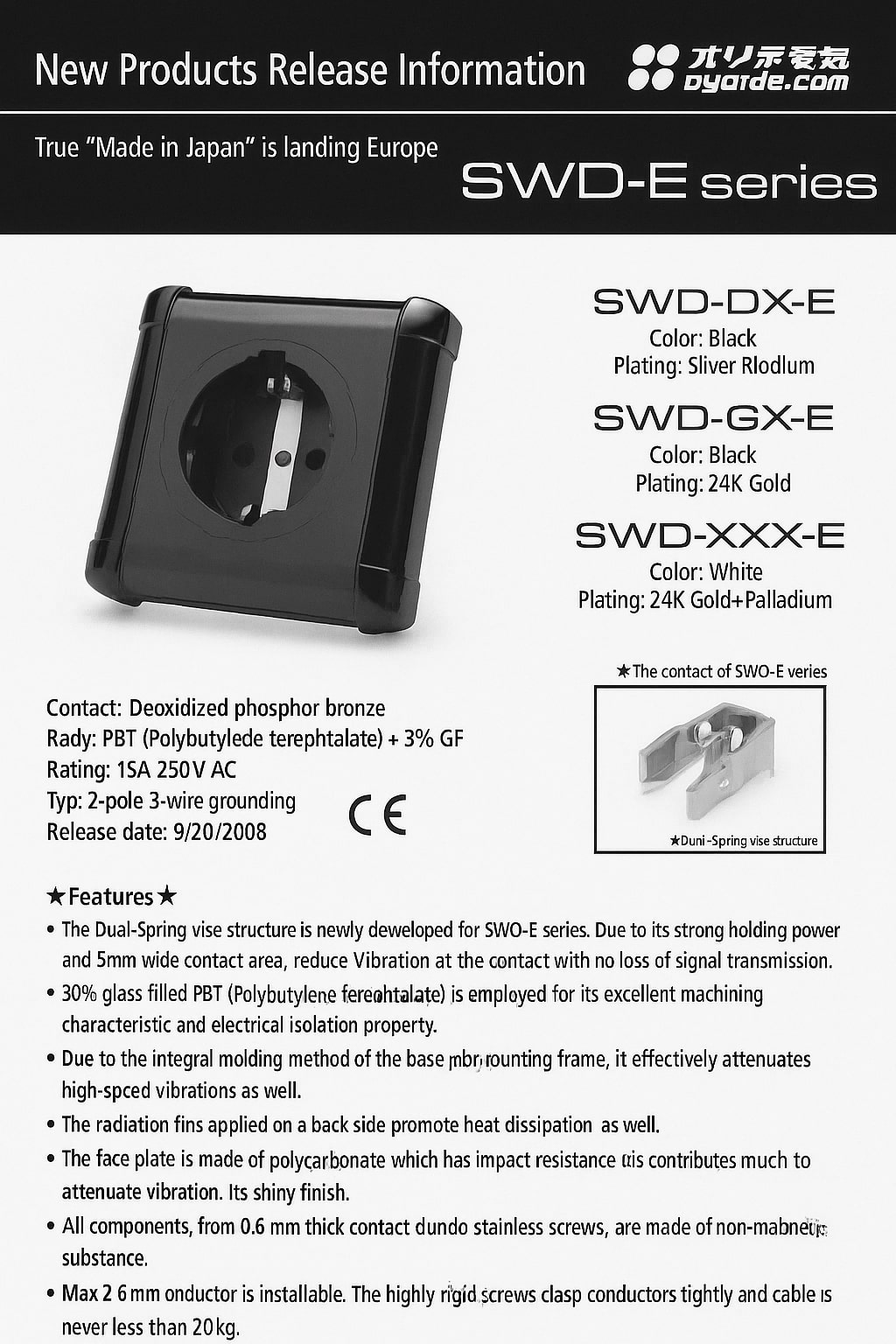 Die Oyaide SWD-GX-E ist eine hochwertige Schuko-Wandsteckdose aus der SWD-E Serie. Sie verfügt über goldbeschichtete Kontakte für eine stabile und zuverlässige Verbindung sowie ein robustes, vibrationsarmes Gehäuse.