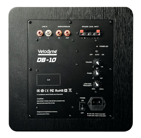 Das geschlossene Gehäuse des DB-10 dimensionierten die Entwickler kompakt, was dem Trend entspricht, aber physikalisch Konsequenzen hat: Ein so knappes Gehäuse bedeutet einen früh einsetzenden Frequenzgang-Sinkflug zu tiefen Tönen hin. Und der muss mit einem spiegelbildlich verlaufenden Equalizer ausgeglichen werden. Das bedeutet wiederum: Der Leistungsverstärker muss kräftig ausfallen, denn schon eine Anhebung von sechs Dezibel bedeutet eine Vervierfachung der Leistung, mit nur sechs Dezibel kommt man aber nicht aus. Dem trägt VeloÂdyne mit einer 350 Watt leistenden Schaltendstufe Rechnung. Der DB-10 bekam die fürs Heimkino notwendige Ausstattung mit auf den Weg, also die stufenlose Regelung von Trennfrequenz, Phase und Pegel. Eine Einmess-Automatik fehlt hingegen.