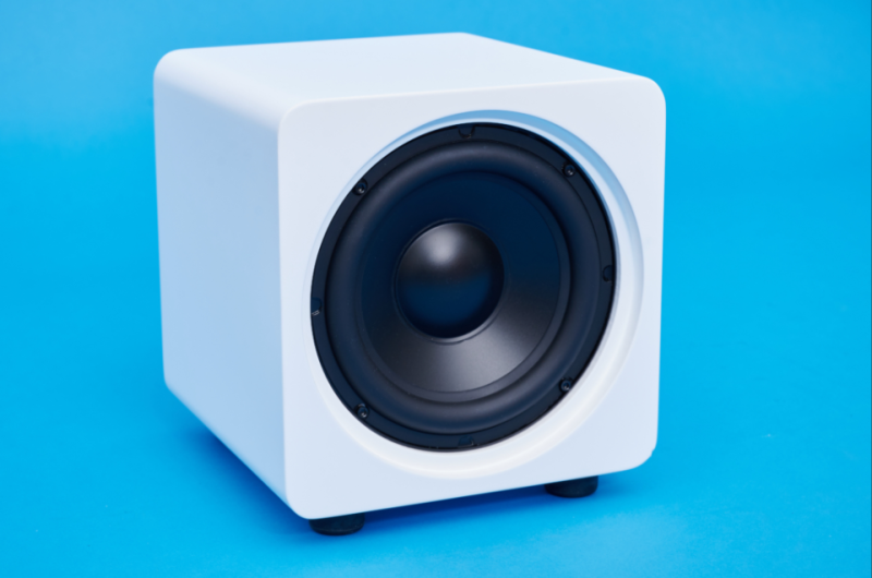 Der kleine Sub hat mit seiner Höhe von 28 Zentimetern und Tiefe von 29 Zentimetern beinahe exakte Würfelmaße. Das Gehäuse besteht aus MDF-Platten, die wahlweise in Schwarz oder Weiß foliert sind. Die Front wird von dem 20 Zentimeter (bzw. acht Zoll, daher der Name) durchmessenden Tieftöner dominiert, beziehungsweise von einer farblich zum Gehäuse passenden Stoffabdeckung.