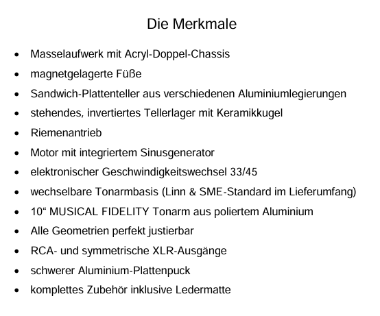 Die Königsdisziplin der Musikwiedergabe ist die analoge Schallplatte und somit ist der Plattenspieler die Krönung einer jeden Musikanlage. Wenngleich auch bereits mit überschaubaren Mitteln oft erstaunliche Ergebnisse erzielt werden können, drängt es den Perfektionisten irgendwann zu einem Objekt, bei dem es keine Kompromisse mehr gibt und jeglichem Detail die maximale Aufmerksamkeit zu Teil wird. Dieses Objekt haben wir nun vor uns: den MUSICAL FIDELITY M8xTT. Die Namensgebung ist zeigt dies auch klar an: Geräte der M8-Linie aus dem Hause MUSICAL FIDELITY genügten schon immer den allerhöchsten Ansprüchen - sowohl ästhetisch wie audiophil. Freuen Sie sich darauf, Ihre Schallplatten sammlung völlig neu zu entdecken!