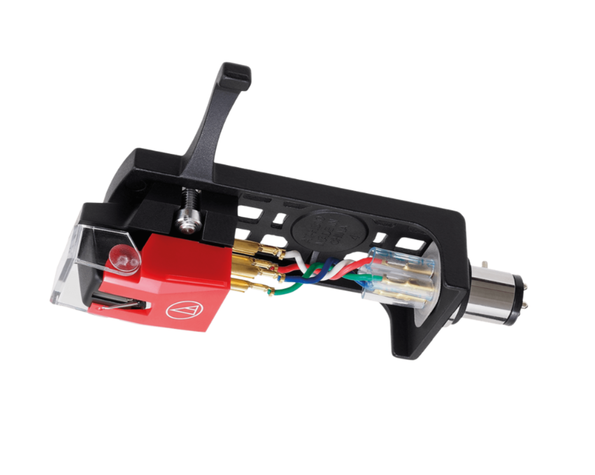 Standard-Modell mit Microlinear-Nadel, vormontiert, mit leichter Aluminium-Headshell (AT-HS10). Dieser Tonabnehmer zeichnet sich selbst im inneren Bereich der Schallplatte durch geringe Verzerrungen aus, da sich der Verrundungsradius auch bei Verschleiß der Nadelspitze nicht ändert.